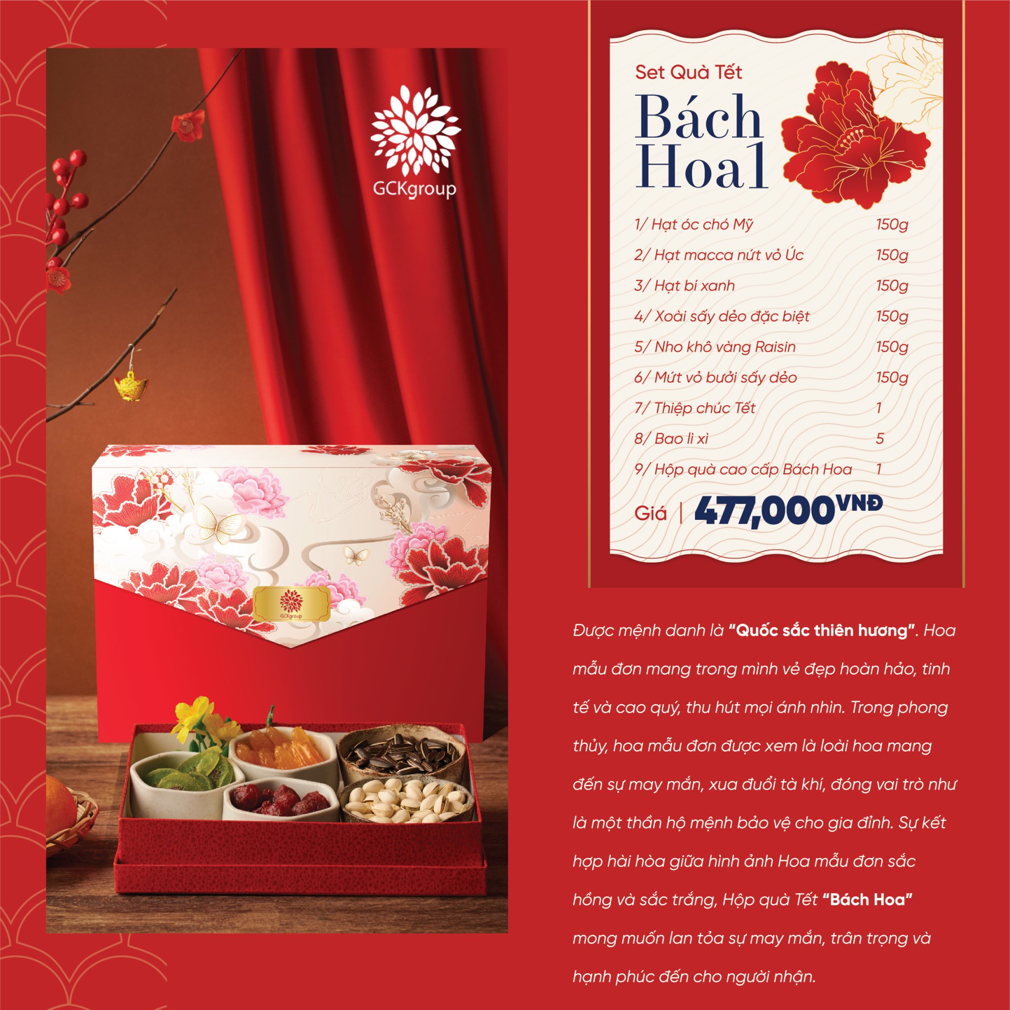 Năm mới đang đến gần và Tết Nguyên Đán 2024 sẽ là dịp để chúng ta cùng nhau chào đón một năm mới đầy hứa hẹn. Và để tạo thêm không khí Tết tràn đầy niềm vui và hạnh phúc, hộp quà Tết “Bạch Hoa 1” của GCK sẽ là một lựa chọn tuyệt vời để tặng cho người thân, bạn bè và đối tác của bạn. Hãy theo chân GCK khám phá những sản phẩm độc đáo và ý nghĩa trong hộp quà Tết này nhé!